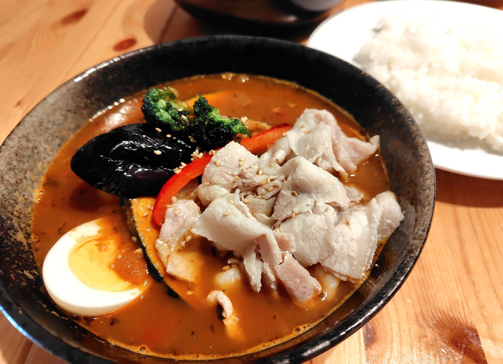 しばらくして運ばれてきたスープカレーは、ゴロッとした素揚げ野菜が彩り豊かで食欲をそそります。