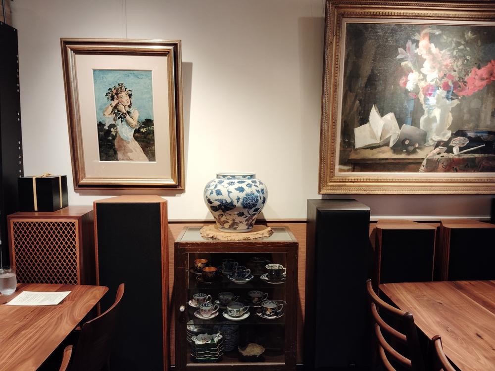 大型スピーカーと置物。遊び心ある店内の一角。