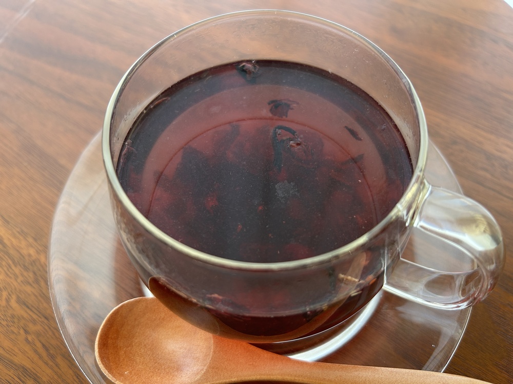 ルビー色のお茶の中には、たっぷりとドライフルーツが沈んでいます。お茶を楽しんだ後、フルーツも召し上がっていただけますよ、とお店の方が教えてくださいました。