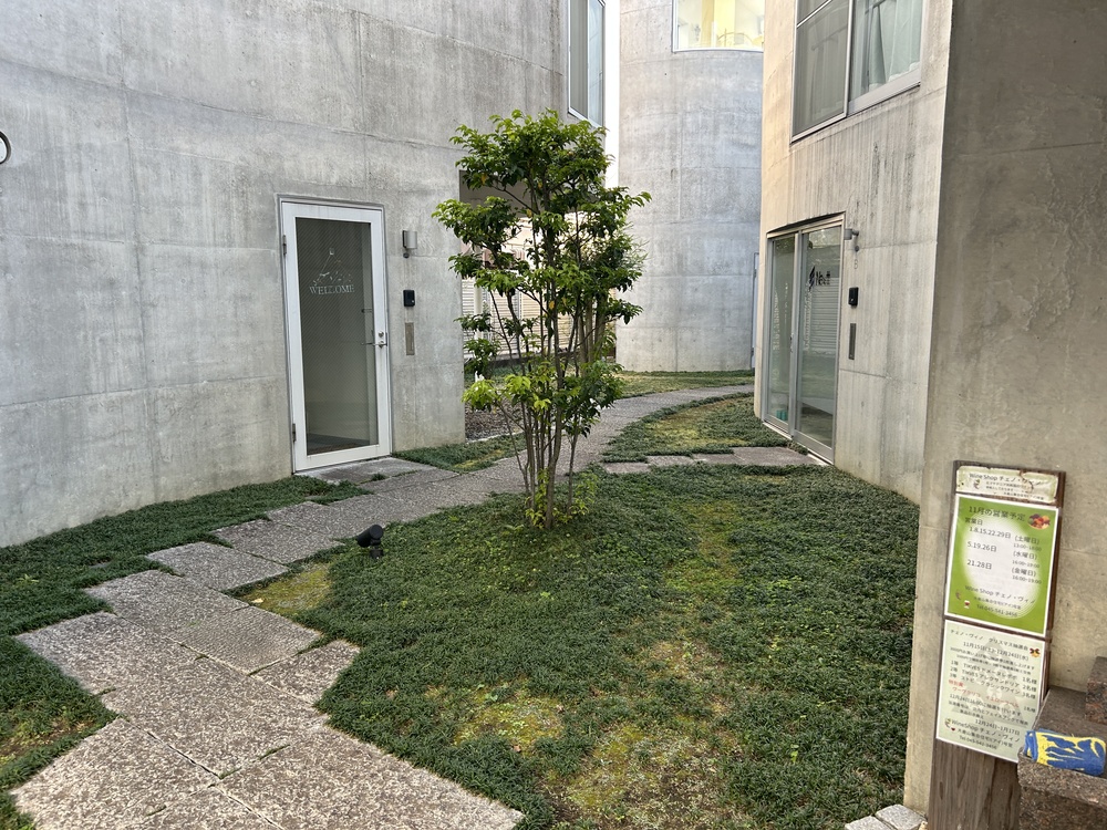 この建物も、曲線を活かした外観で、いくつもの小さな庭があるのも特徴的です。建物の間の緑の小道を抜けると、お店の入口が見えてきます。
