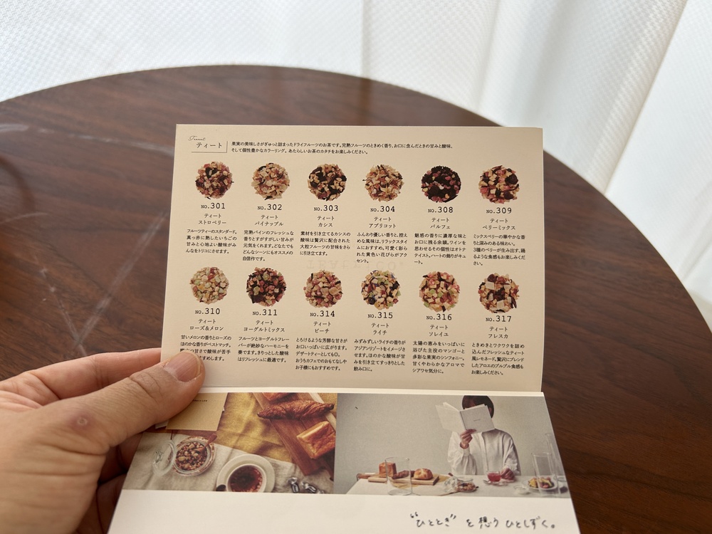 今回は、温かいドライフルーツのお茶をいただくことにしました。選んだフレーバーは「ティートパルフェ」です。