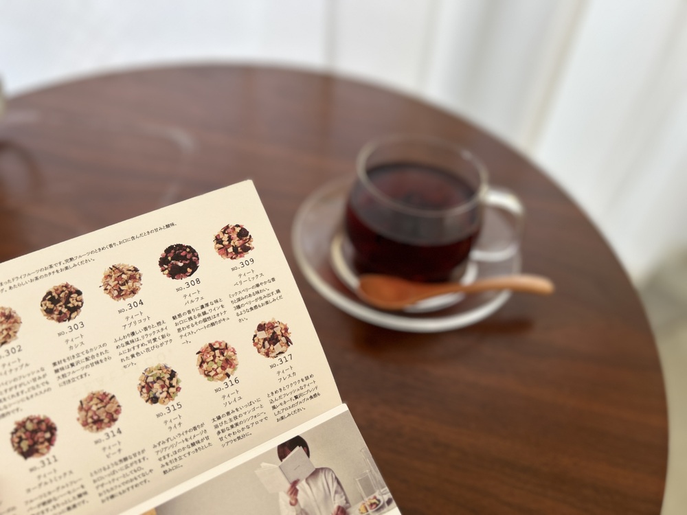 注文した品が来るまでの間、フロアを歩き回って本棚を眺めて好みの本を探したり、なにげなく1冊手に取ってパラパラとページをめくってみたりして過ごしました。これはと思う本を数冊選んで席に戻ると、ふわりと甘い香りが漂いました。お茶が運ばれてきたのです。
