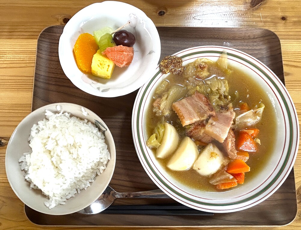 この日のメニューは、野菜たっぷりのポトフ、炊きたてのごはん、そして彩り豊かなフルーツの盛り合わせです。