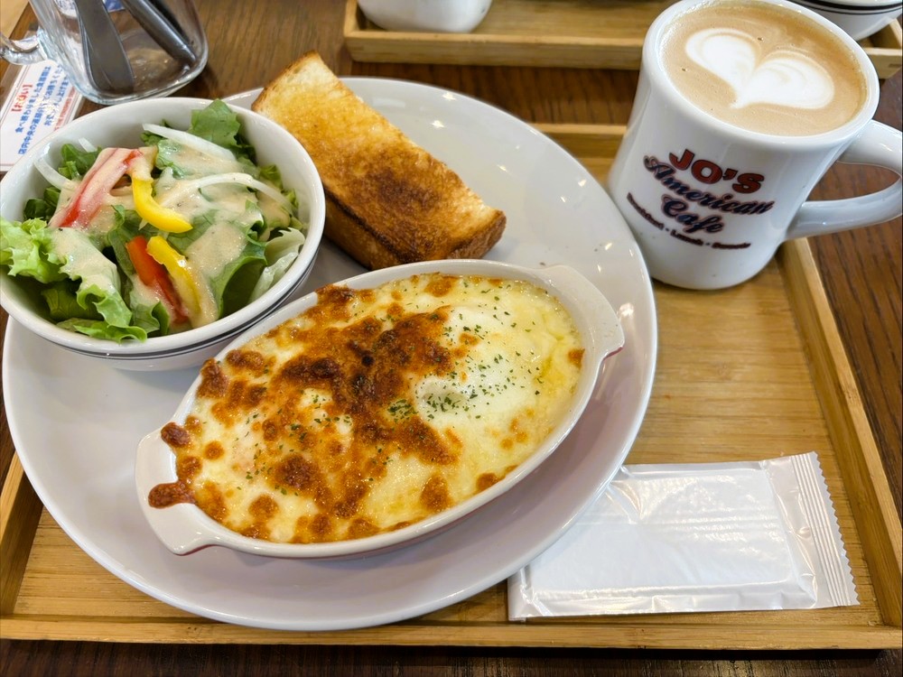 悩んだ結果、朝にグラタンを食べられる点に惹かれ、ジャックプレートを注文!ドリンクはホットのカフェラテをチョイスしました。