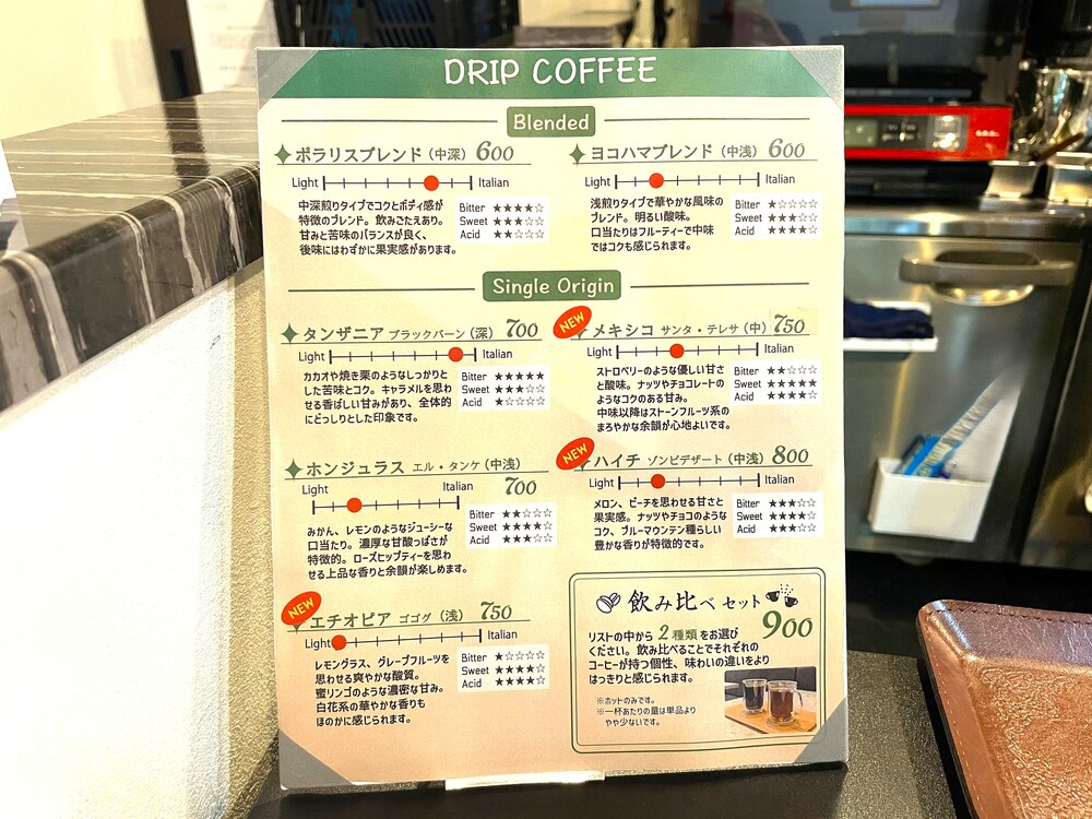 元町ではコーヒーが飲めるお店が増えていますが、Polaris coffeeではオーダーを受けてから淹れる、こだわりのドリップコーヒーが特徴。また、コーヒーを中心としたドリンクやスイーツなどのメニューも豊富にあります。