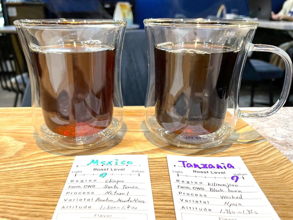 選んだのは「タンザニア」と「メキシコ」。飲み比べと聞いていたので、もっと小さめのカップで提供されるのかと思っていましたが、予想以上にたっぷりの量。飲みごたえがあって、お得感もあります。