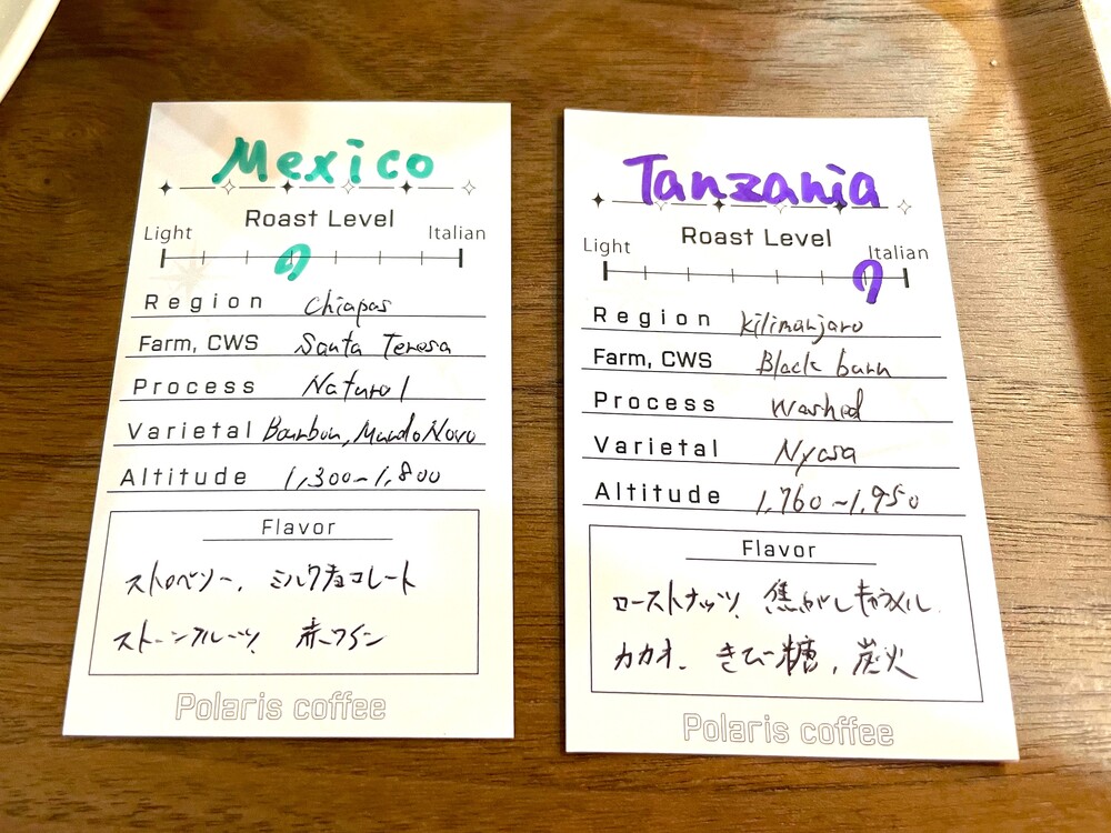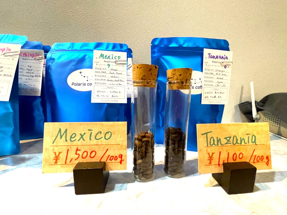 Polaris coffeeのオリジナル・ブレンドの他、タンザニアやメキシコなどのシングル・オリジンもあります。シングル・オリジンは時期によって入れ替わることがあるそうです。