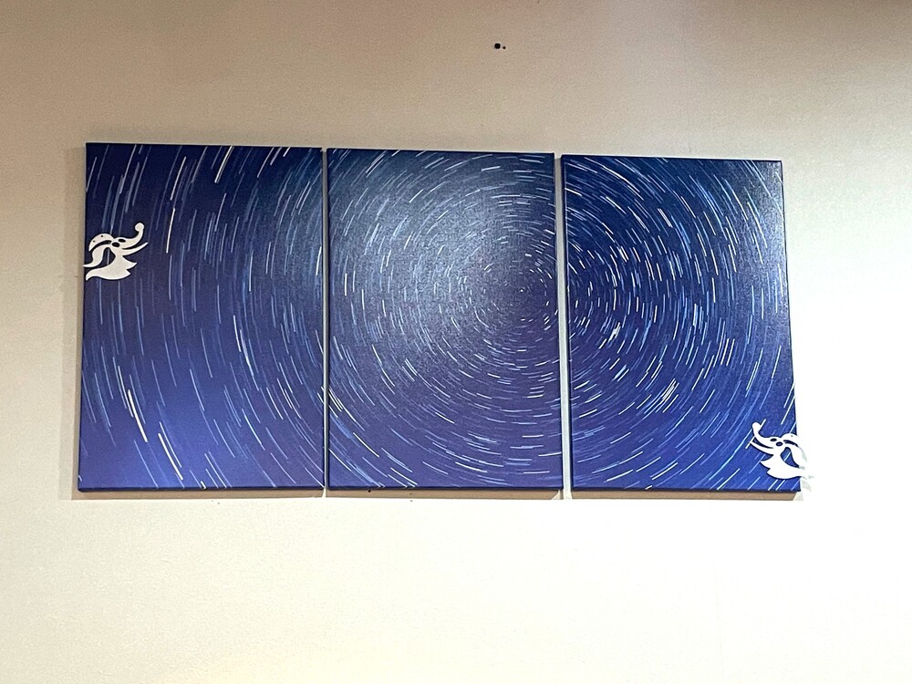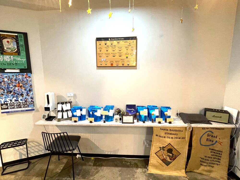 お店の名前にもある「Polaris」は“北極星”を意味しています。“北極星”のイメージにリンクするネイビーブルーのアートやコーヒーのパッケージが店内のインテリアを引き締めています。