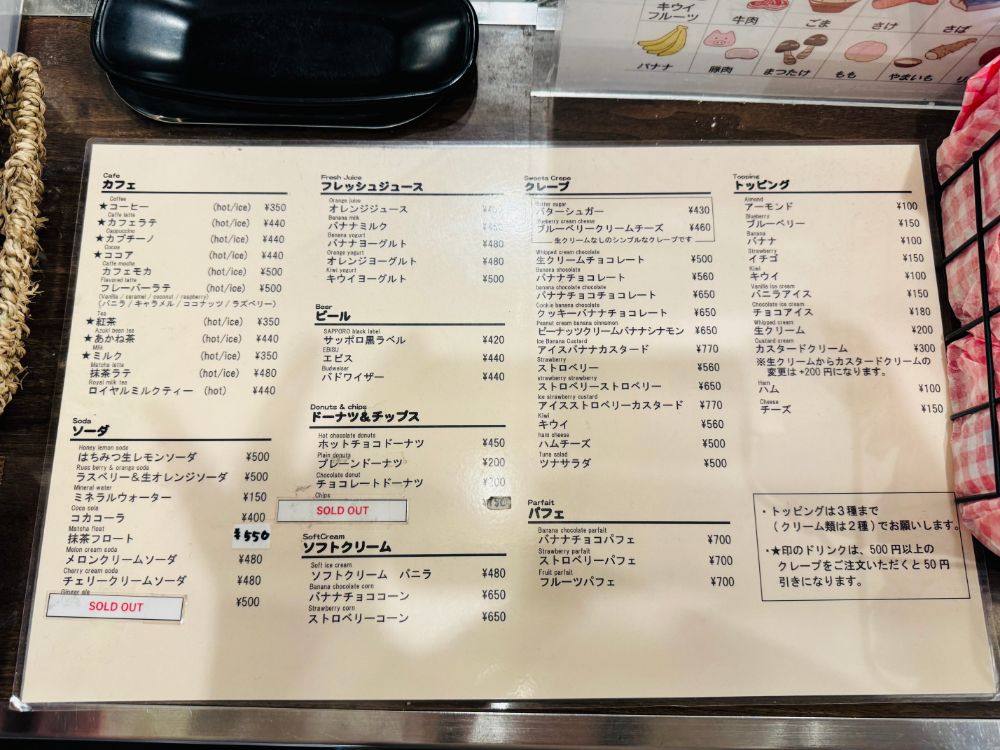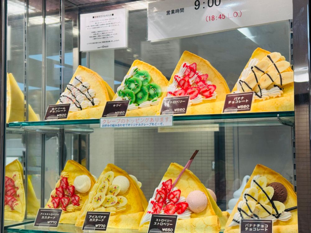 レジ横のショーケースには、色とりどりのクレープメニューがずらりと並び、思わず目を奪われます。