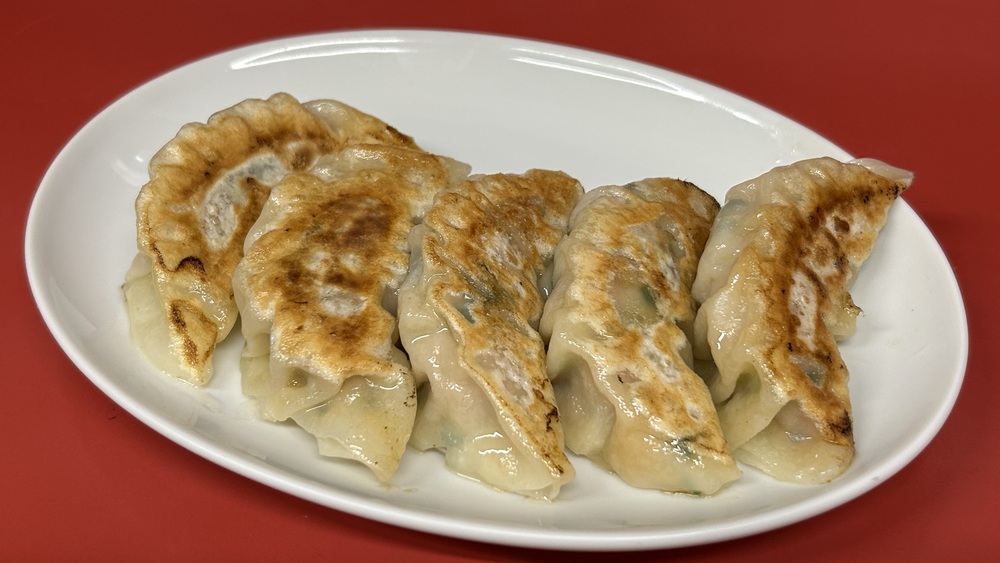 あつあつの湯気を上げて、焼きたての餃子がやってきました。大きめ5個です。焦げ目がついておいしそうです。真っ赤なカウンターに白いお皿、あざやかな色の対比に、餃子が映えています。