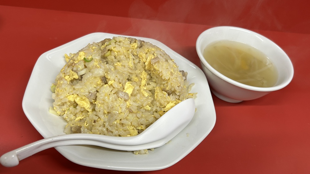 続いて、こちらも湯気があがる炒飯がやってきました。こうばしい香りがふわっと立ち上がります。もやし入りのスープが付いてきます。