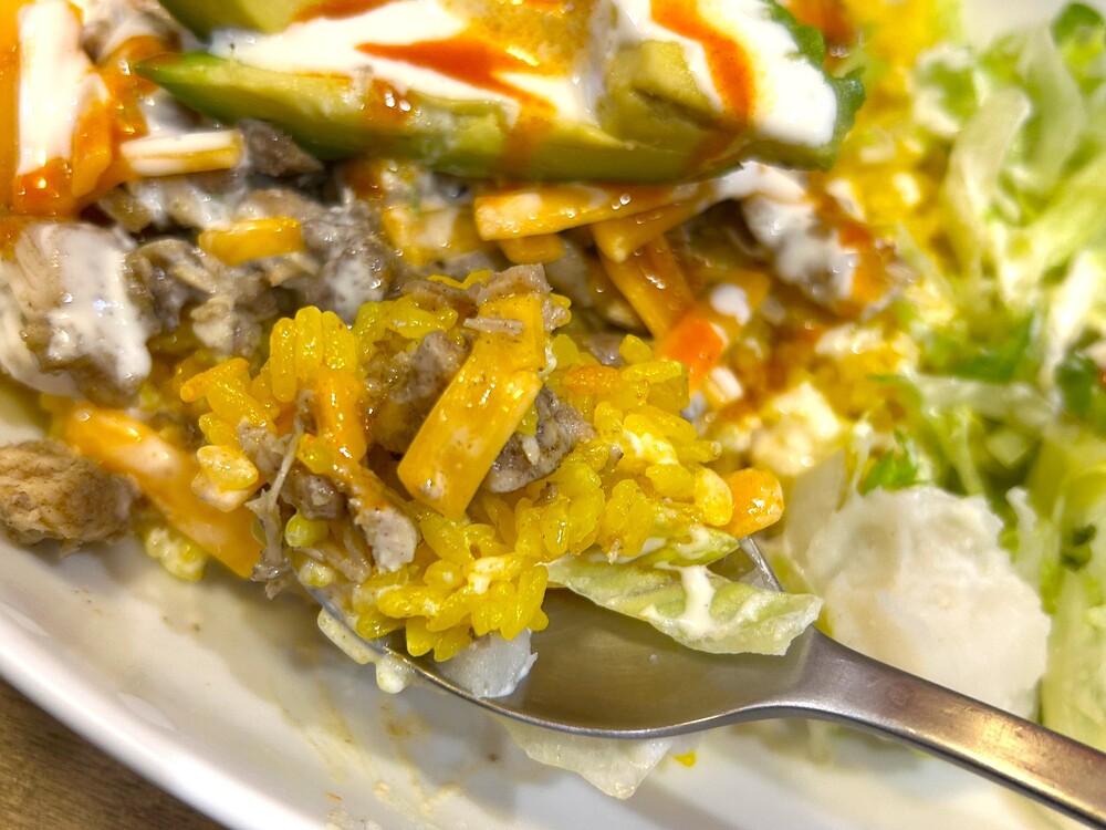 お肉のじゅわっとした脂と、よく炒めたターメリックライスがよく合います。