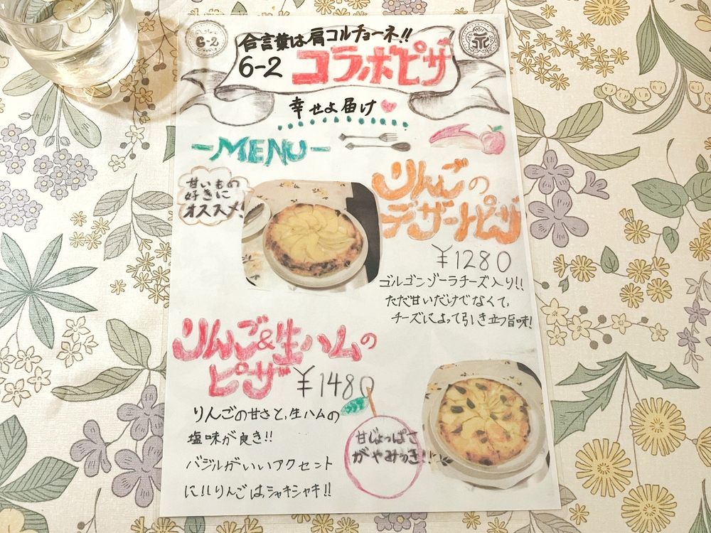 さらに、近所の小学校とコラボした「りんごのデザートピザ」もあり、地域とのつながりを大切にしているお店であることが伝わってきます。