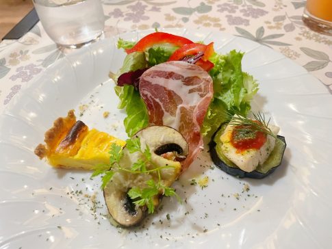この日の前菜は、大きなマッシュルームのステーキ、甘味のある紅はるかのキッシュ、赤ナスの上にメカジキをのせた一品。