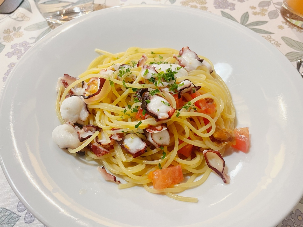 ペペロンチーノはプリッとしたタコがたっぷり入っていて、しっかりとした辛味がアクセントになっていました。