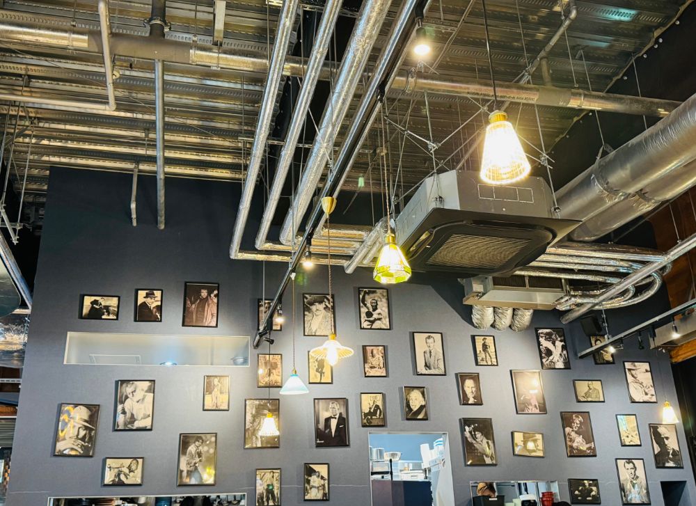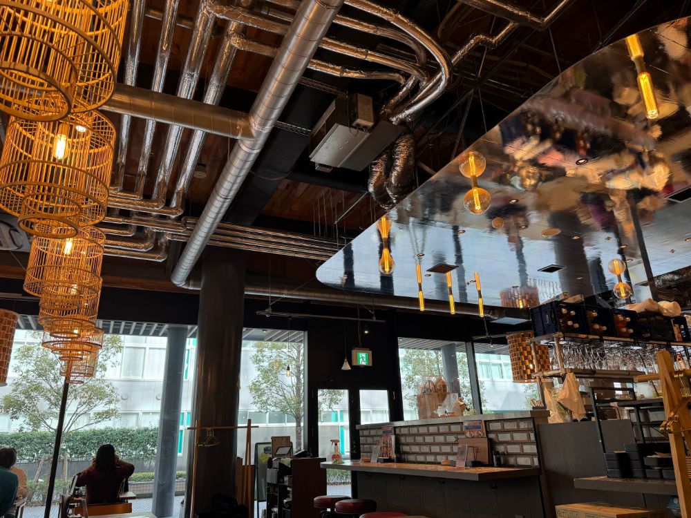 モダンな照明やあえて見せた配管が印象的な天井は、スタイリッシュでおしゃれな雰囲気を演出しています。