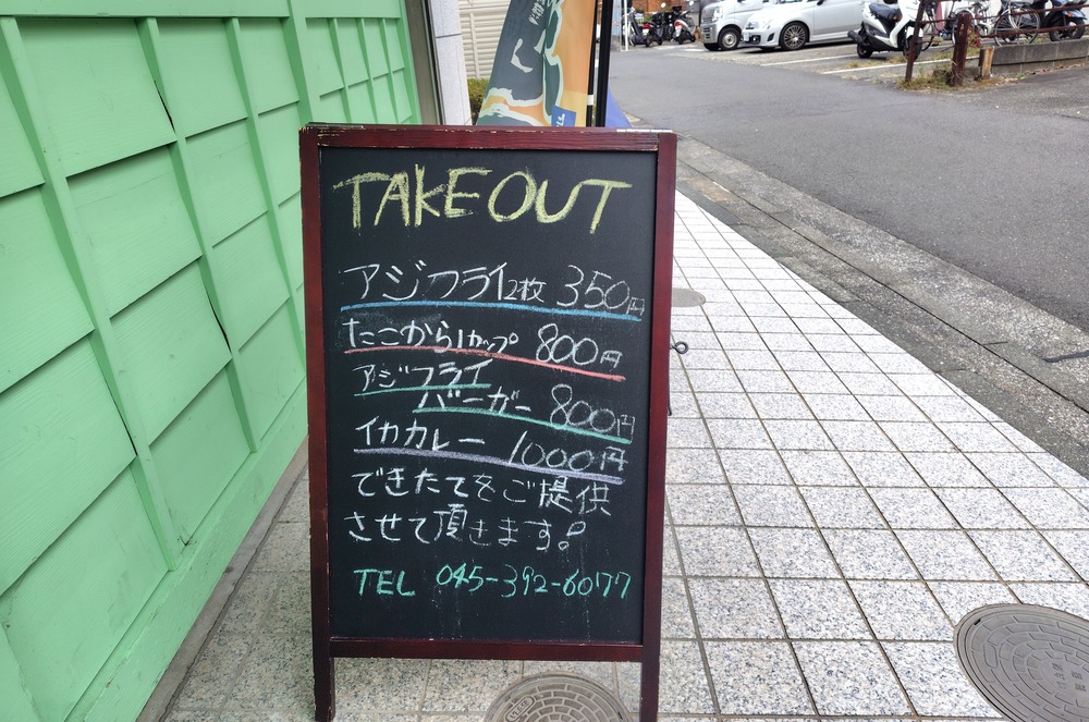 カフェ風の看板には居酒屋のようなテイクアウトメニューが書かれていて、これまた意表をつかれます。
