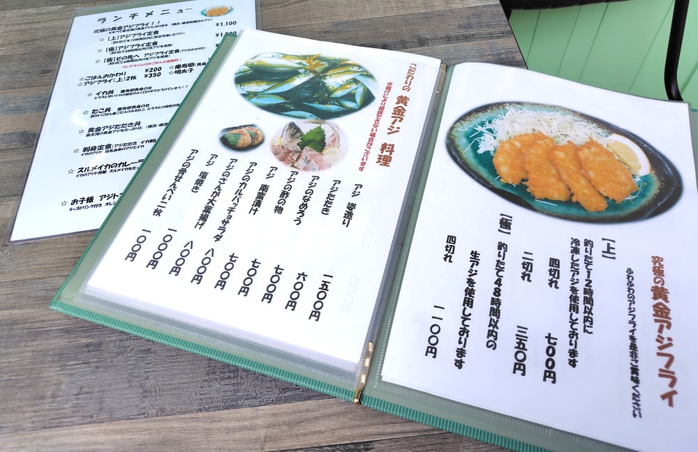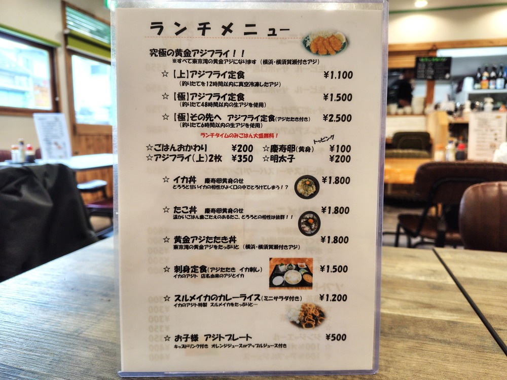 置いてあるランチメニューを見ると、アジフライ定食だけでもなんと3種類もあります!