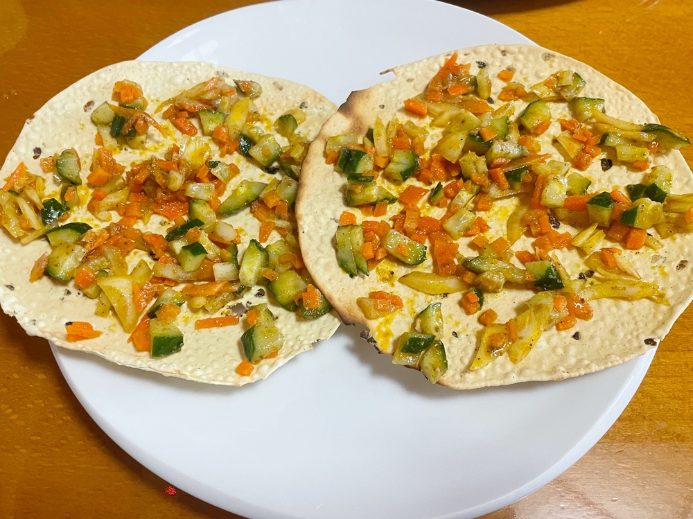 マサラパパドは、パリパリ食感の薄焼きせんべいのような生地の上に酸味の効いた野菜がのっています。