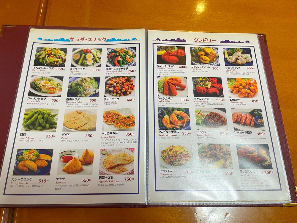 席についてメニューを開くと、カレーの種類はもちろん、サイドメニューがずらり。