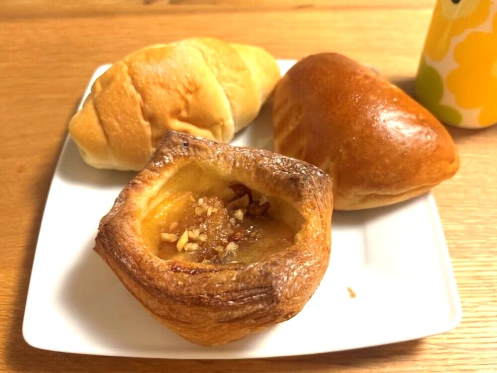 アップルシナモンデニッシュとクリームパン、塩パンの3種類を家で待つ娘のお土産にしました。