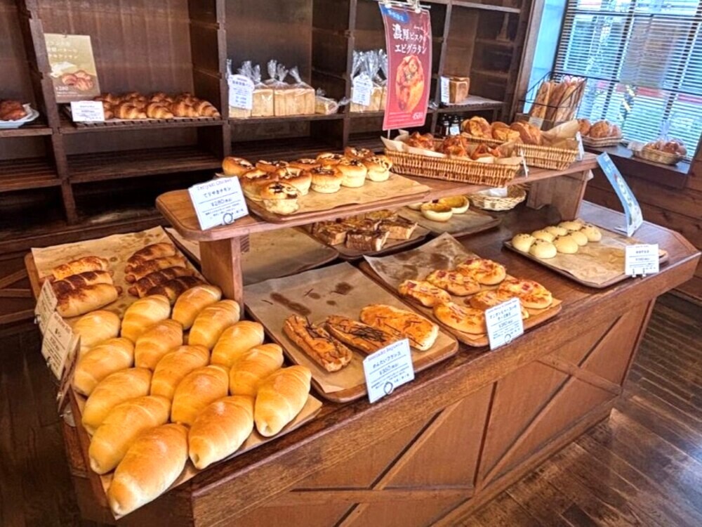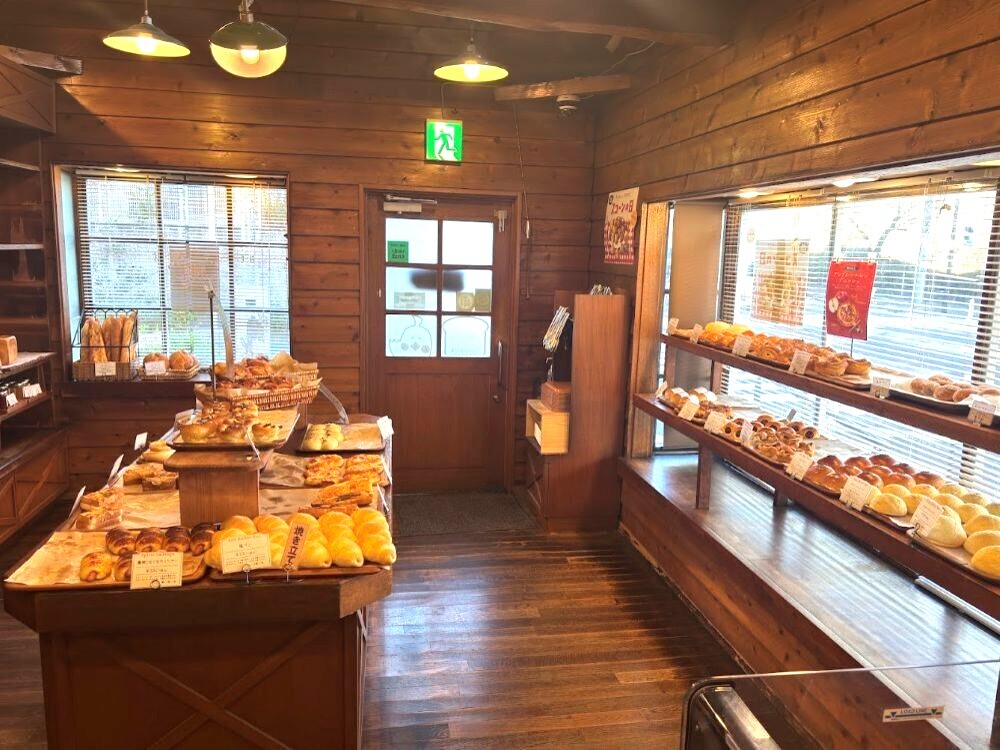 店内に足を踏み入れると、そこは木のぬくもりを感じるカントリー調の落ち着いた空間。パンの焼ける幸せな香りに満たされた店内には、おいしそうなパンがずらりと並んでいます。