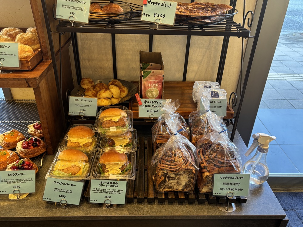 店内には定番の食パンやクロワッサン、バゲットといった王道商品から、デニッシュや総菜パン、バーガー系まで幅広く並んでいます。